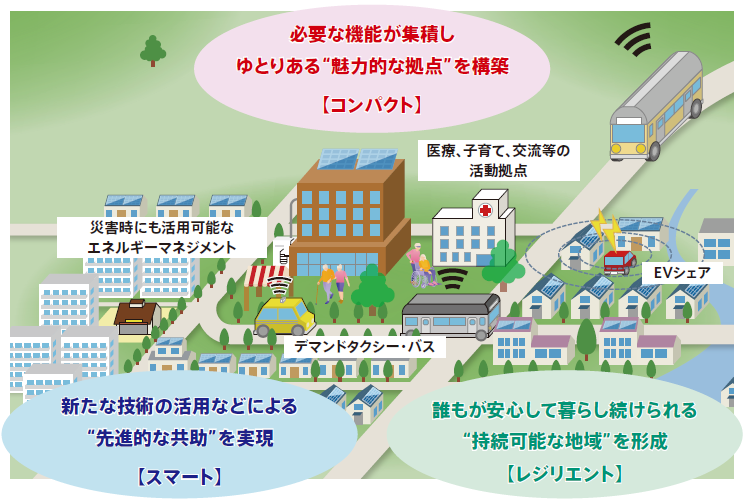 埼玉県では、超少子高齢社会を見据え、市町村の「コンパクト」「スマート」「レジリエント」の3つの要素を兼ね備えた持続可能なまちづくりを支援するプロジェクトである「埼玉版スーパー・シティプロジェクト」を推進しています。これにより、コンパクトなまちづくりを進めつつ、スマート技術の活用により利便性を高め、災害に強く、エネルギーも途絶えない、持続可能なまちの構築を目指します。