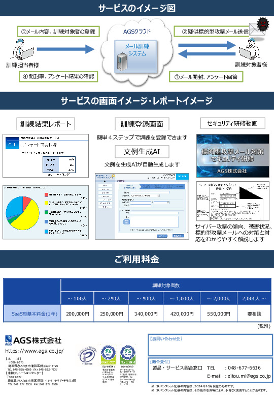 その他日々の訓練で標的型攻撃メールから会社を守る「標的型攻撃メール対応訓練サービス」やセキュリティ商品のご紹介のパンフレット等、各種資料をご用意しておりますのでお気軽にお立ち寄りください。