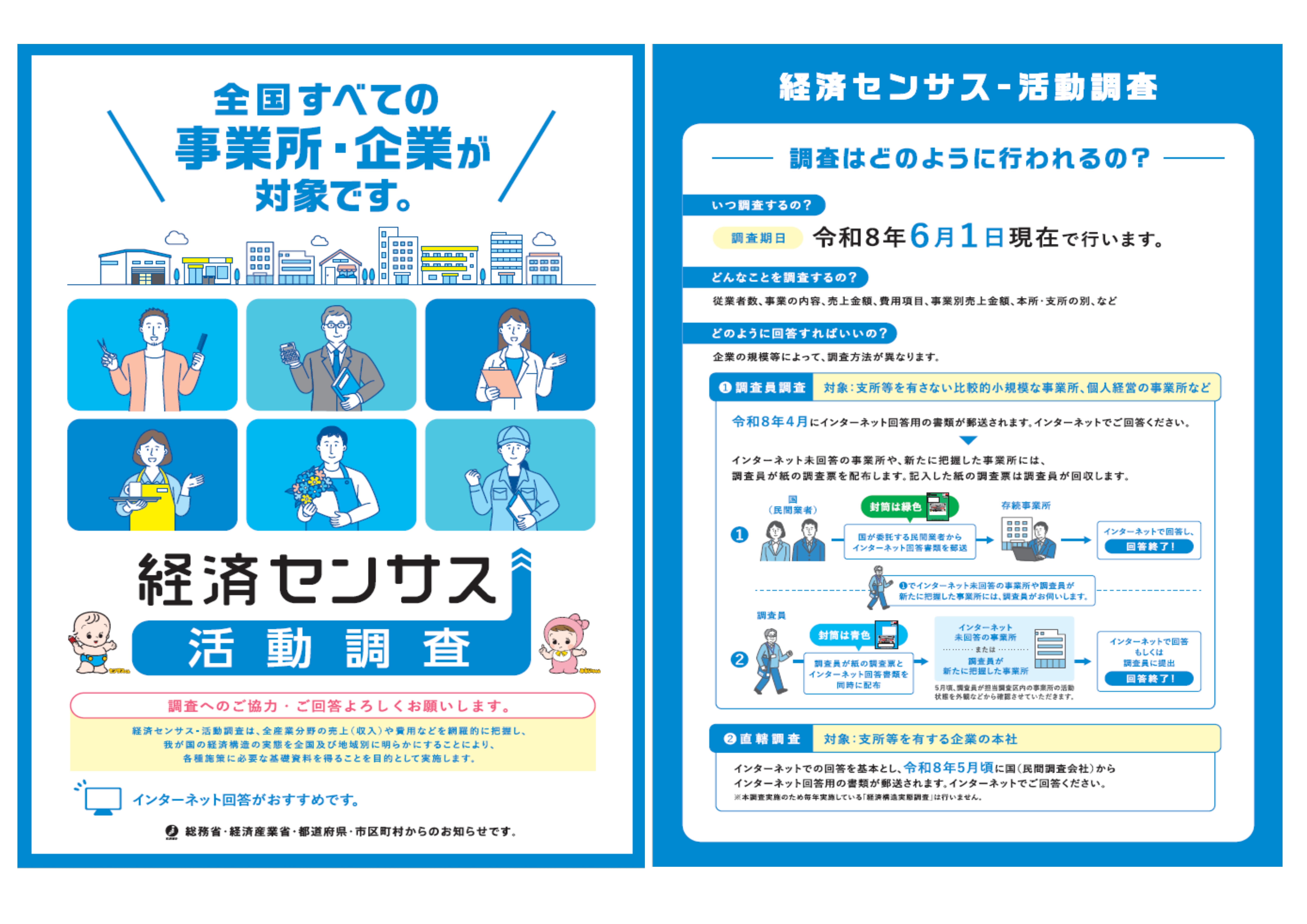 総務省と経済産業省は、令和8年6月1日現在で「令和8年経済センサス‐活動調査」を実施します。「経済センサス‐活動調査」は、全国すべての事業所および企業を対象に、売上(収入)金額や費用などの経理項目を同一時点で網羅的に把握することにより、我が国の事業所・企業の経済活動を全国および地域別に明らかにすることを目的としています。調査結果は、物価高騰対策の各種支援制度をはじめ、経営支援制度や補助金の検討材料、地域防災計画の策定、商店街等の活性化指標、さらには地域ごとの既存店舗の状況把握や新規店舗の出店計画の基礎資料として、幅広く活用されています。皆様のご理解とご協力のもと、正確な調査の実施が可能となります。ご回答のほど、よろしくお願いいたします。