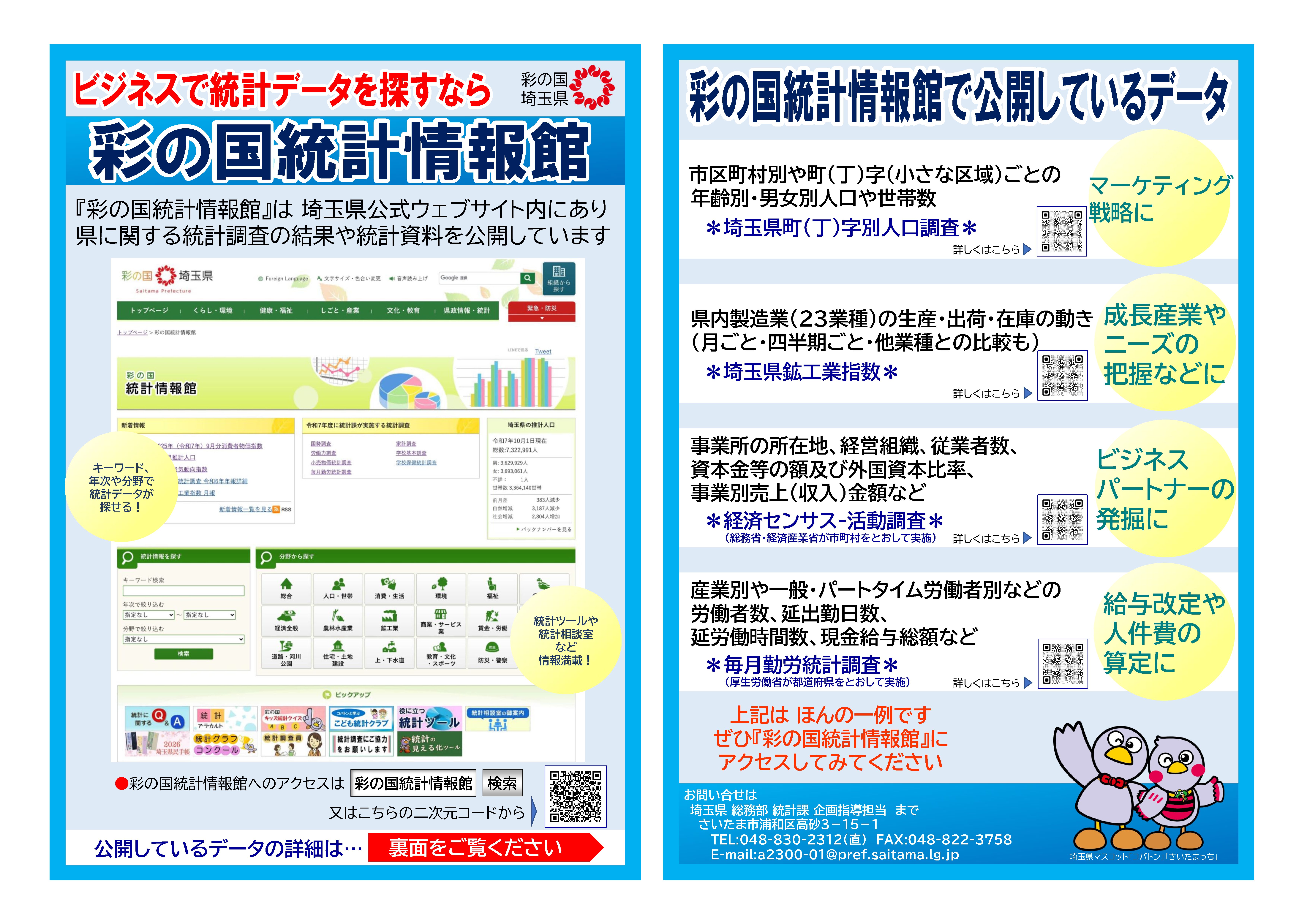 埼玉県統計課や国が実施している統計調査の紹介、埼玉県公式HP内「彩の国統計情報館」の紹介、埼玉県統計課が開発しHPで公開中の、統計データが簡単な操作で分析できる「役に立つ統計ツール」の紹介、埼玉県民手帳の紹介、など。