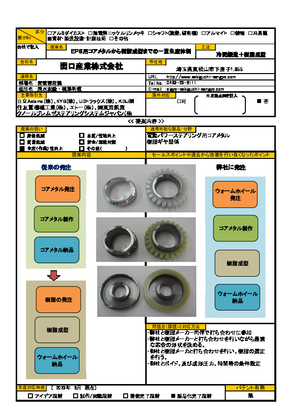 埼玉県の東松山市で1937年に創業。乗用車、トラックのパワーステアリング用の部品の他、建設機械、医療機器等に使用される部品も製造しております。冷間鍛造から機械加工まで一貫生産しておりますので、これらを活用し様々な提案が可能です。また、NC旋盤約90台、バー材加工機5台、5軸含むマシニングセンター7台等、試作から量産まで対応可能な生産能力があり、少量多品種の対応もしております。