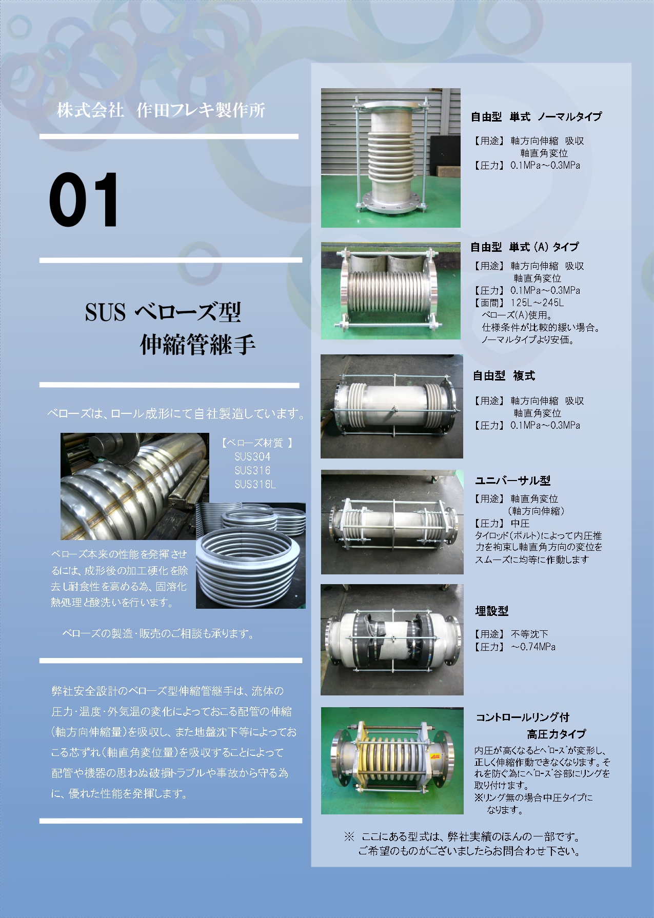 創業1962年来、『ベローズ型伸縮管継手』『フレキシブルメタルホース』を自社にて設計・製造をしております。多くのプラント設備や水処理、環境設備等へ納品させて頂いております。その多くの実績を基に、設計・検証試験によってアップデートした豊富なデータと、製作技術を磨き「安心・安全・確実な製品を融通のきかせたモノづくり」でこれからも社会インフラのお役にたてるよう、より一層の完成度を高めていく所存です。