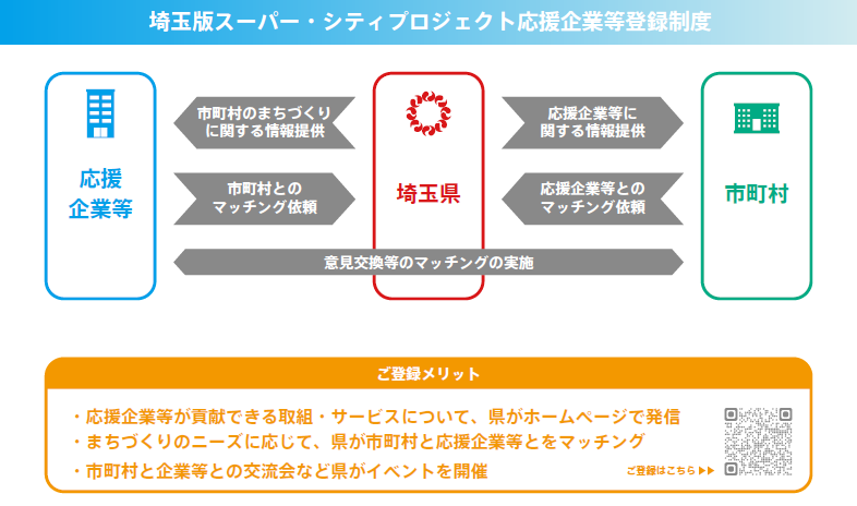 埼玉版スーパー・シティプロジェクト応援企業等登録制度は、プロジェクトの趣旨に賛同するとともに、プロジェクトの実現に資する知見、技術、アイデア等を持つ企業等を募集・登録し、市町村とマッチングを行うことを目的としています。