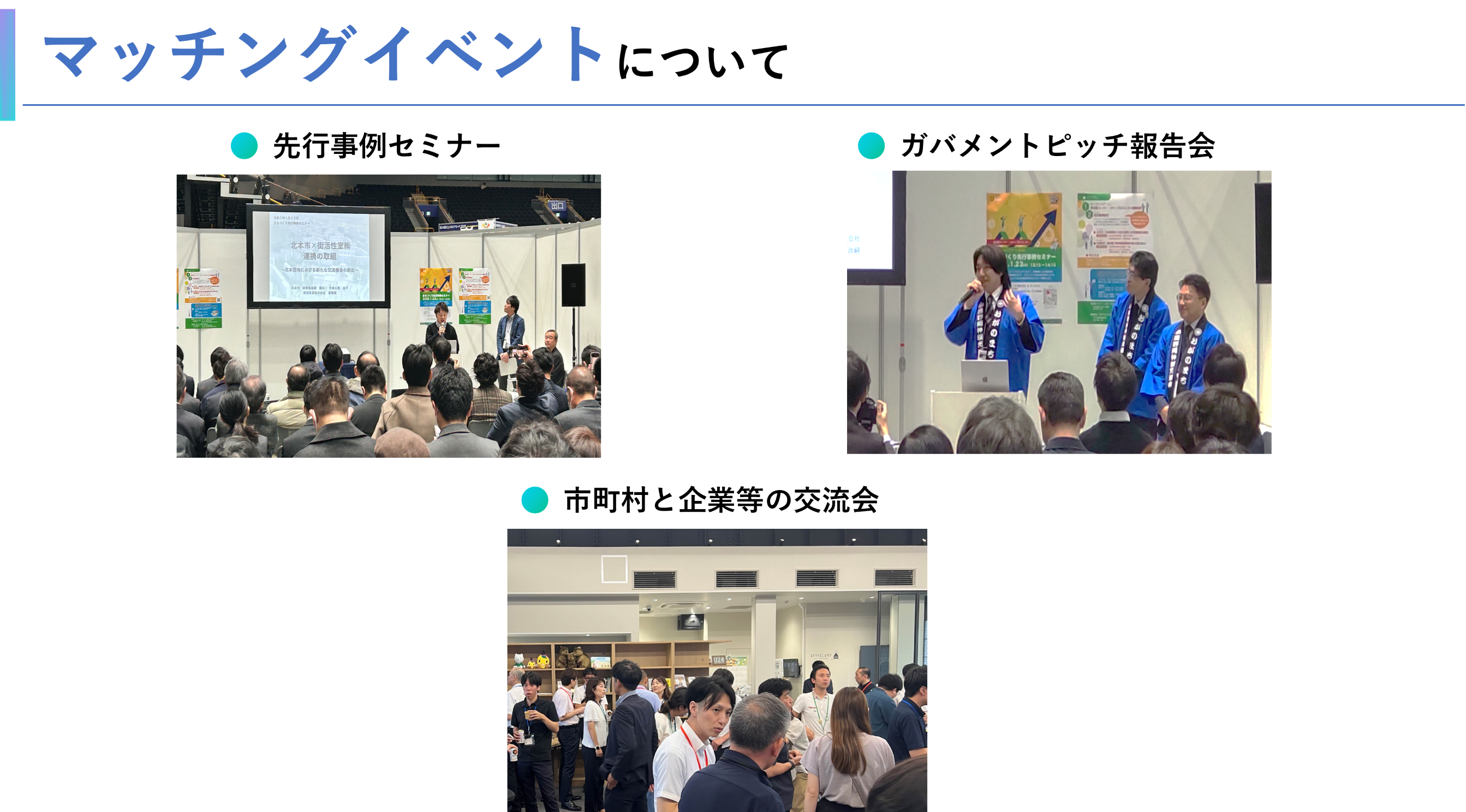 プロジェクトに先行して取り組んでいる自治体の事例紹介等を行う「まちづくり先行事例セミナー」や、市町村と応援企業等が集まり、まちづくりに向けた取組に関する意見交換等を行う「市町村と応援企業等の交流会」、市町村が地域課題を提示し、民間企業等に課題解決策の提案を求めるイベントである「ガバメントピッチ」を開催するなど、両者のマッチング強化に取り組んでいます。