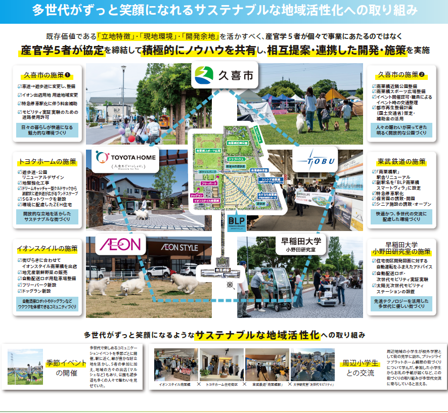 「産官学の垣根を超え積極的な相互提案とシナジー開発・施策」による課題解決、「地域資産の活用・新テクノロジー導入」による人流の創出を図り、多世代が快適に暮らせる郊外のモデルとなる、地域への愛着を高めるまちづくりが行政・学術・産業(鉄道・商業・住宅)の5者連携で行われました。