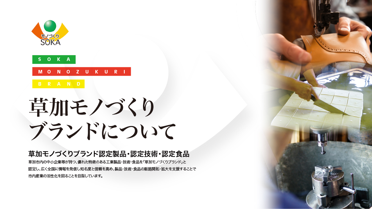 草加市内の中小企業等が持つ、優れた特徴のある工業製品・技術・食品を「草加モノづくりブランド」と認定し、広く全国に情報を発信し知名度と信頼を高め、製品・技術・食品の販路開拓・拡大を支援することで市内産業の活性化を図ります。