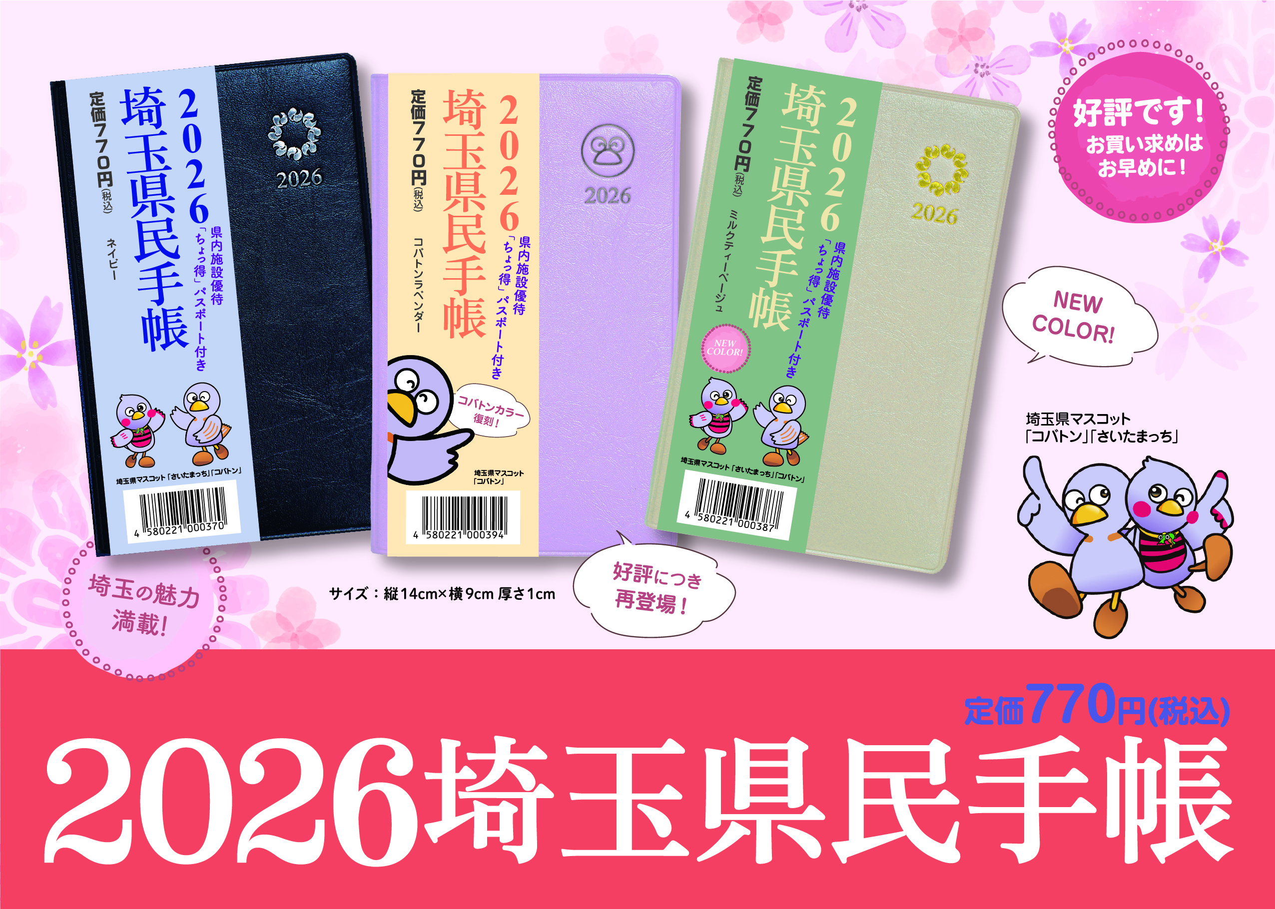 埼玉県の統計データ満載で、多くの県民の皆さまに愛され続けている「埼玉県民手帳」の2026年版を、令和7年10月15日(水)に発売しました。埼玉県民手帳は、1953年(昭和28年)版発売以来、様々な方に御愛用いただいているロングセラー商品です。県・市町村・国の主要統計データをはじめ、過去5年間の天気が分かる週間カレンダーや、テレホンガイド、鉄道路線図など、生活に便利な情報が満載です。今年の表紙カラーは定番ネイビーに加えて、新色ミルクティーベージュと一昨年好評だったコバトンラベンダーの3色で販売しています。手帳の提示により県内39の施設で割引や特典サービスが受けられる「ちょっ得」パスポートも付いて価格は1冊770円(税込み)です。市役所・町村役場や県内一部書店、コンビニエンスストア、ホームセンターなどでお買い求めいただけます。この機会に是非お買い求めください。https://www.pref.saitama.lg.jp/a0206/kenmin-tecyo.html