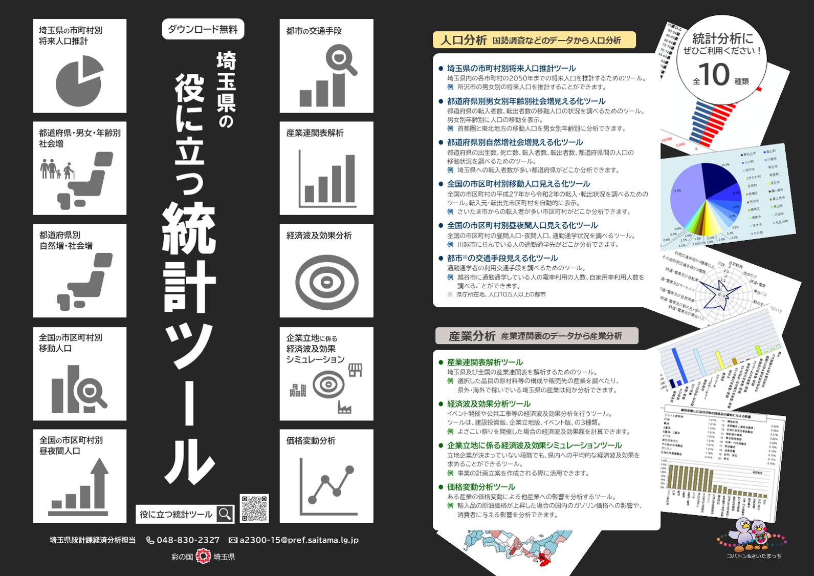 埼玉県統計課や国が実施している統計調査の紹介、埼玉県公式HP内「彩の国統計情報館」の紹介、埼玉県統計課が開発しHPで公開中の、統計データが簡単な操作で分析できる「役に立つ統計ツール」の紹介、埼玉県民手帳の紹介、など。