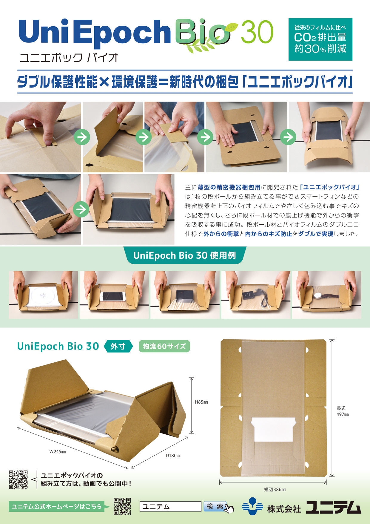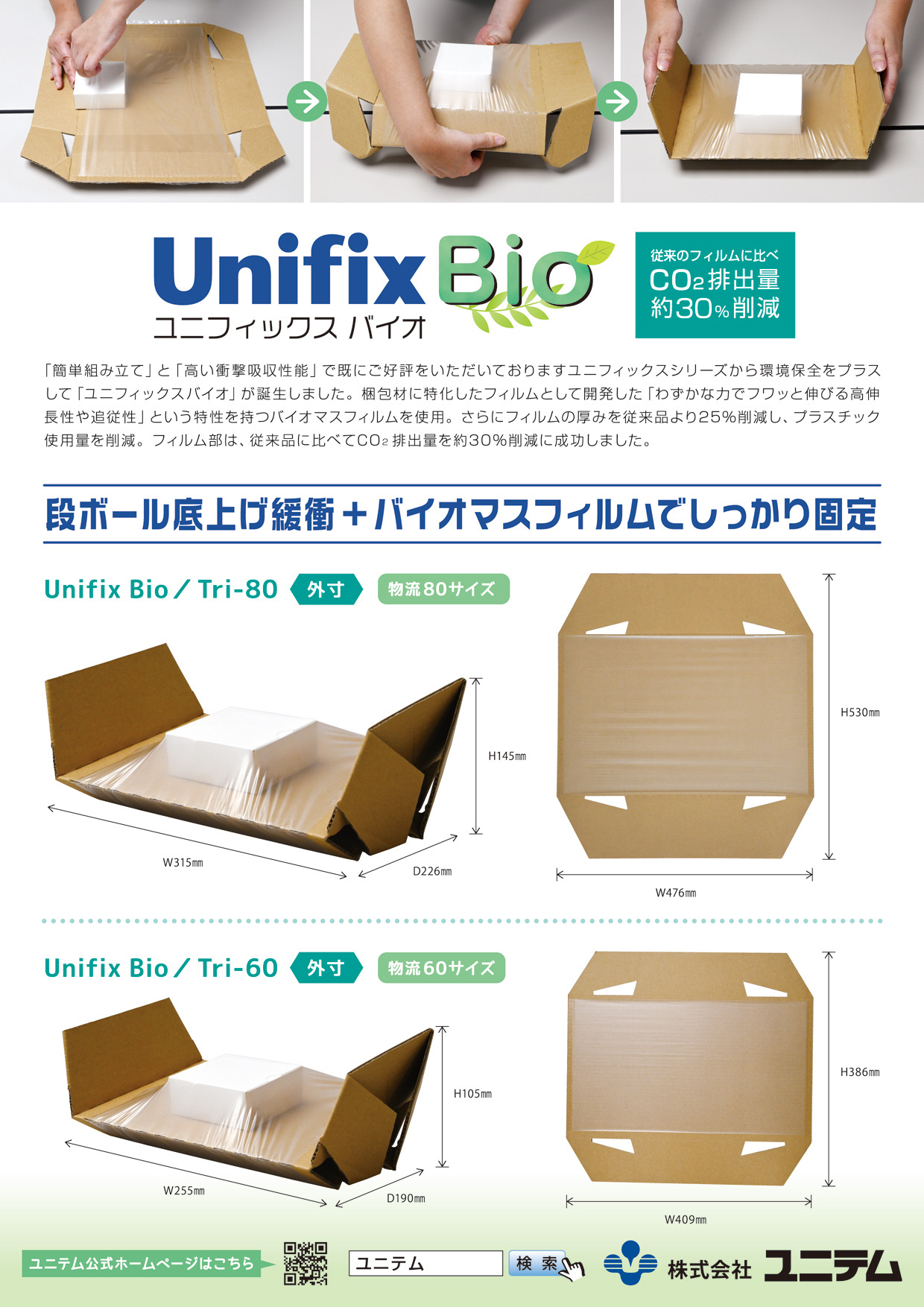 フイルム付梱包材は汎用性があり、形の違う商品もしっかり固定できることで梱包材の共通化が可能となります。フイルムとダンボールの接着は熱溶着なので環境面にも対応し、分別も簡単に行えます。