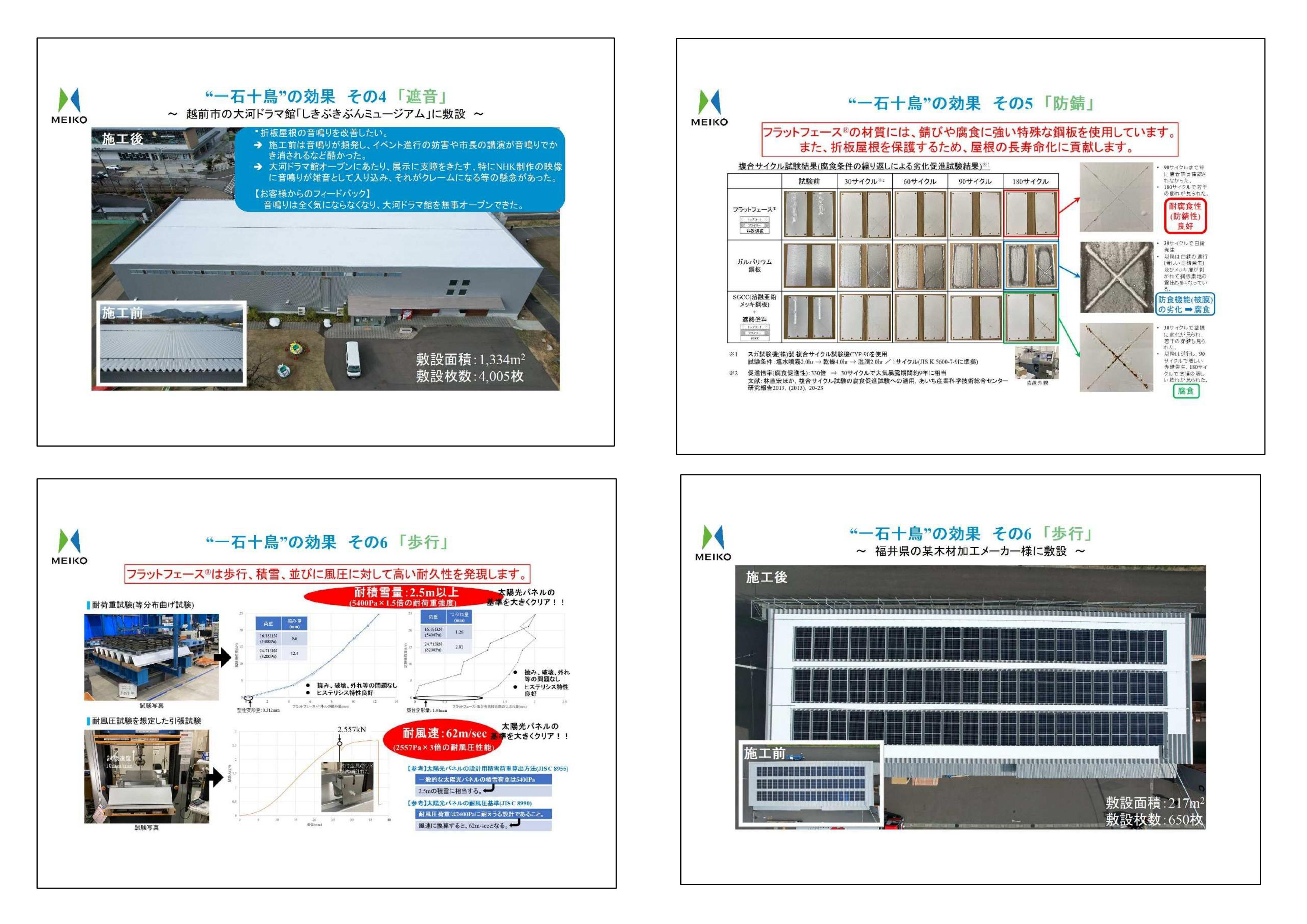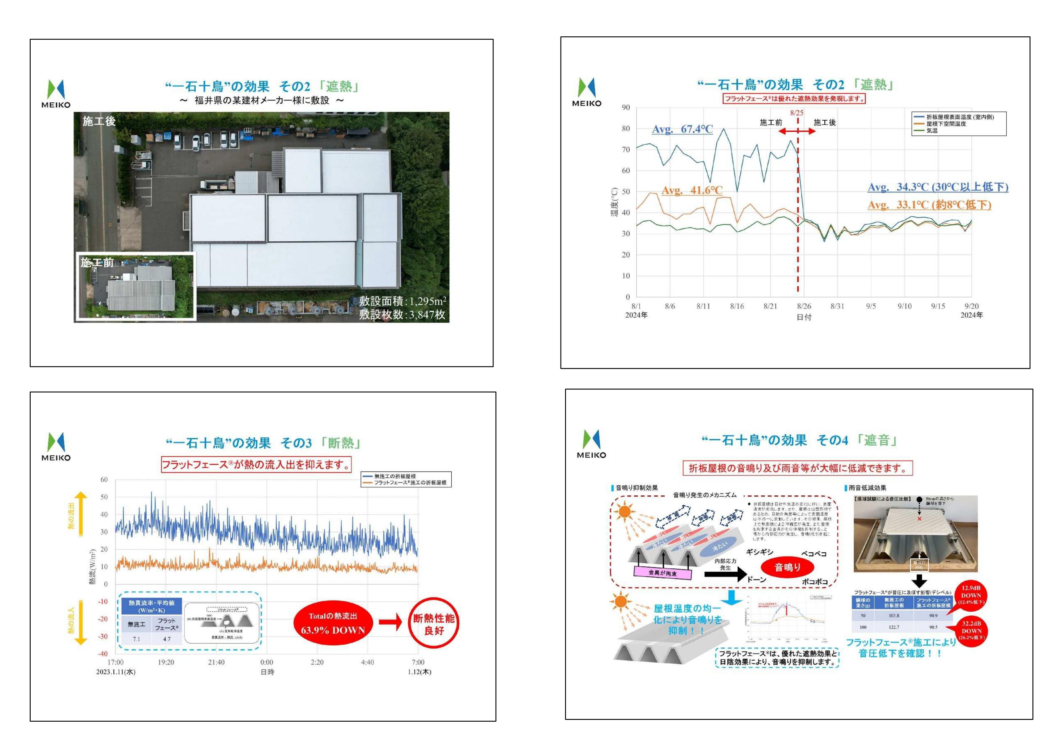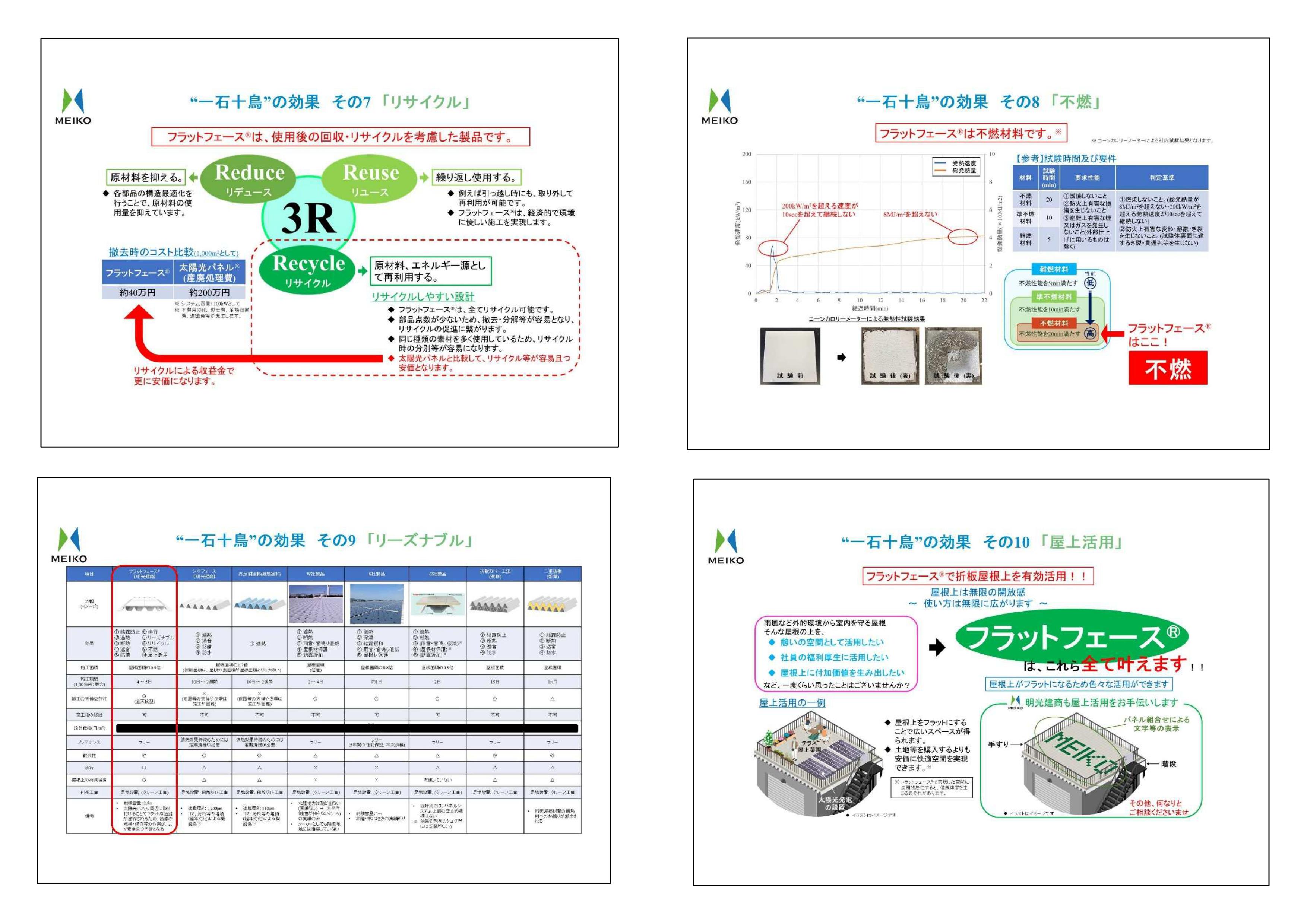 工場などの金属製折板屋根上に敷設する「フラットフェース®」は、折板屋根の諸課題を一挙に解決できるソリューションです。「フラットフェース®」を金属製折板屋根に取り付けるだけで結露防止、遮熱、断熱、遮音、防錆、歩行、リーズナブル、リサイクル、不燃、屋上活用と一石十鳥の効果を発揮します。