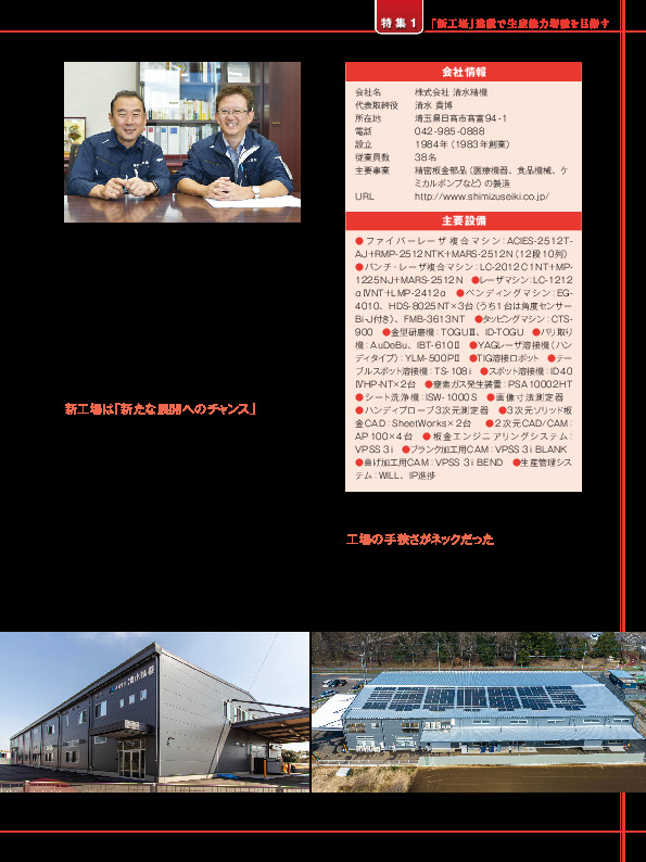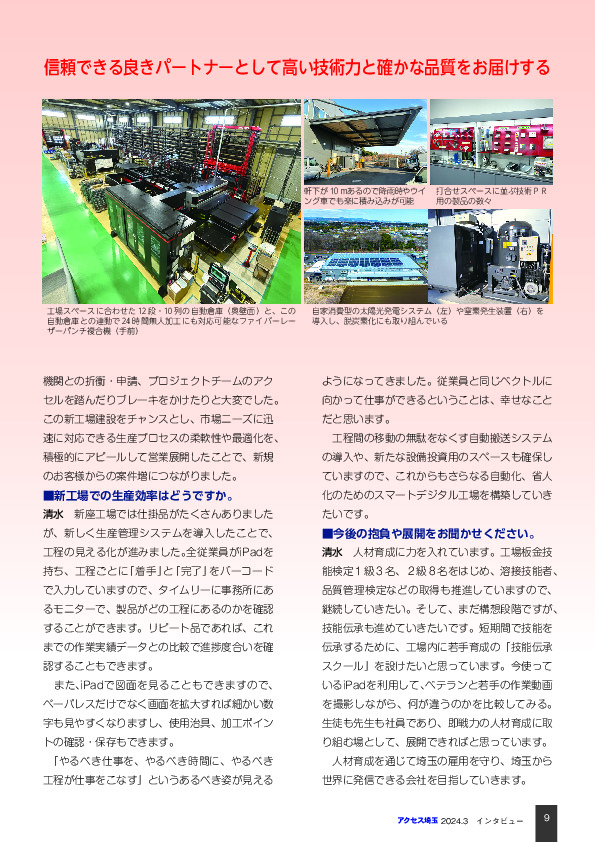 弊社は医療機器・光学測定機器・食品機械向けなどの精密板金加工から溶接まで一貫生産を行う企業です。主要取引先は約100社、ステンレス・鉄・アルミなど幅広い素材に対応し、試作から量産まで手がけています。2023年5月には生産能力向上と作業環境改善を目的に日高市に新工場を竣工。動線の最適化や生産管理システムの導入により、工程の「見える化」と生産効率の大幅向上を実現しました。全社員がiPadを活用し、リアルタイムで工程進捗を把握できる体制を整備。自動搬送システムやスマート工場化にも取り組んでいます。今後は、技能検定や品質管理資格の取得促進に加え、若手育成のための「技能伝承スクール」設立も構想中。ベテランの技を動画で可視化し、次世代へ確実に伝えることで、地域雇用を守りながら、埼玉から世界に発信できるものづくり企業を目指しています。