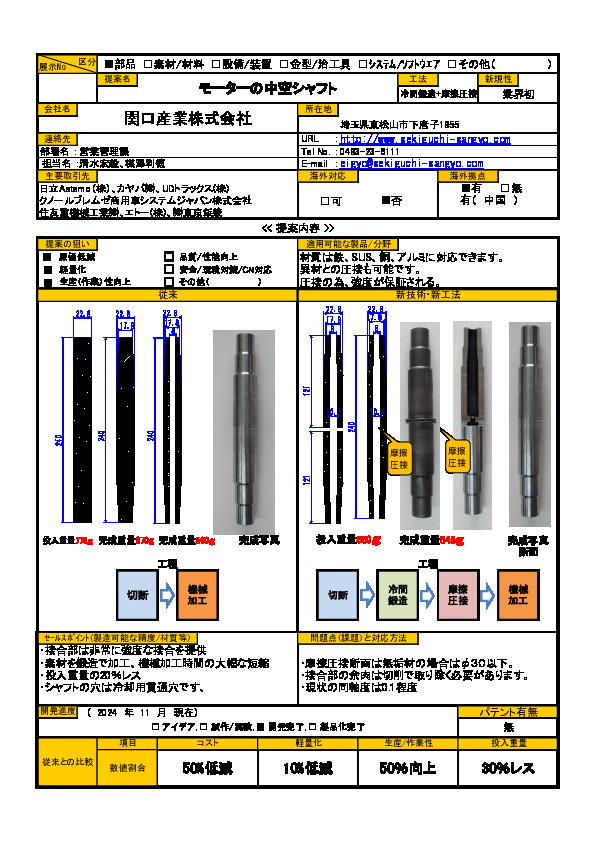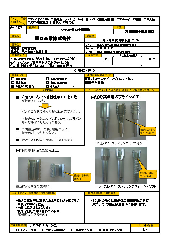 埼玉県の東松山市で1937年に創業。乗用車、トラックのパワーステアリング用の部品の他、建設機械、医療機器等に使用される部品も製造しております。冷間鍛造から機械加工まで一貫生産しておりますので、これらを活用し様々な提案が可能です。また、NC旋盤約90台、バー材加工機5台、5軸含むマシニングセンター7台等、試作から量産まで対応可能な生産能力があり、少量多品種の対応もしております。